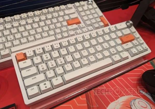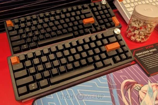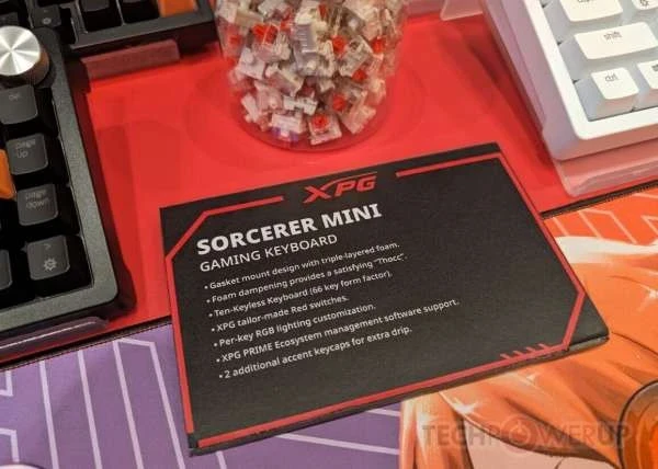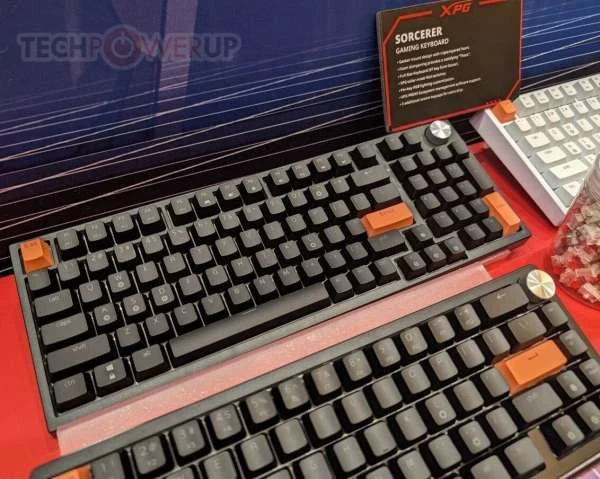 XPG также оставила немного места на стенде для своей новой линейки игровых клавиатур Sorcerer — стандартная модель представляет собой «полноразмерную» плату с форм-фактором 96 %, доступную в черном или белом цвете. Простая эстетика Sorcerer может быть нарушена несколькими (тремя) дополнительными клавишами с акцентом XPG. Серебристый диск управления, похоже, является стандартным креплением. Конструкция с прокладкой и тройным пенополиуретановым слоем обеспечивает изысканный и приятный набор текста. XPG оснастила Sorcerer специальными переключателями Red и системой RGB-подсветки на каждую клавишу (управляется и настраивается с помощью программного обеспечения XPG Prime).