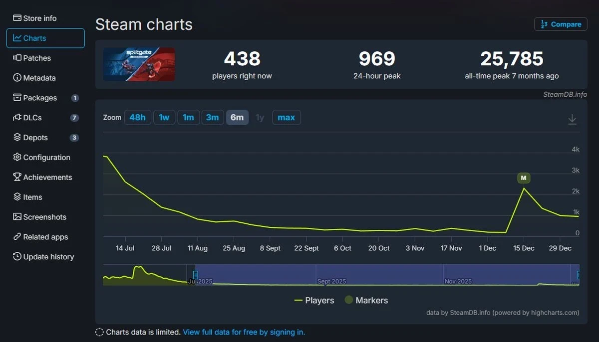 Во-вторых, пиковый онлайн стремительно полетел вниз. Если на запуске летом шутеру удалось привлечь почти 26 тысяч одновременных пользователей, то с конца декабря показатель упал до 1000 игроков. А сейчас и вовсе опустился ниже.