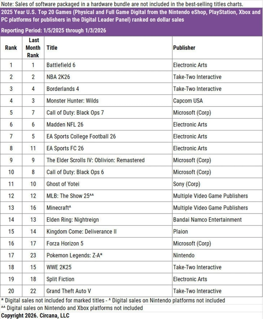 Обложка: скриншот Battlefield 6Известный аналитик Мэт Пискателла из Circana рассказал о самых продаваемых играх в США за декабрь прошлого года и весь 2025-й в целом.