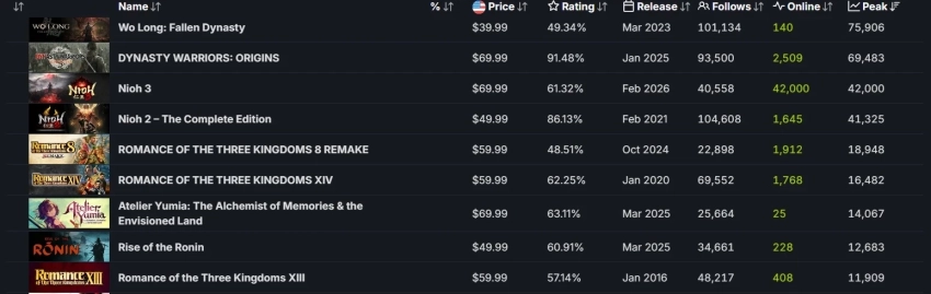 В Steam новинка уже привлекла рекордный для серии пиковый онлайн — 42 тыс. игроков одновременно. Он продолжает расти (да и выходные впереди), поэтому будем следить за тем, удастся ли Nioh 3 обойти другие игры Koei Tecmo Games.