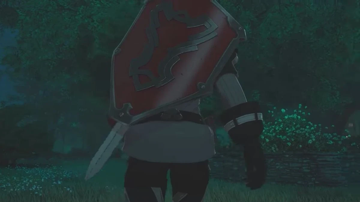 В видео показывают фрагмент локации, выдержанной в средневековом фэнтезийном сеттинге и ситуэт героя с щитом и мечом.